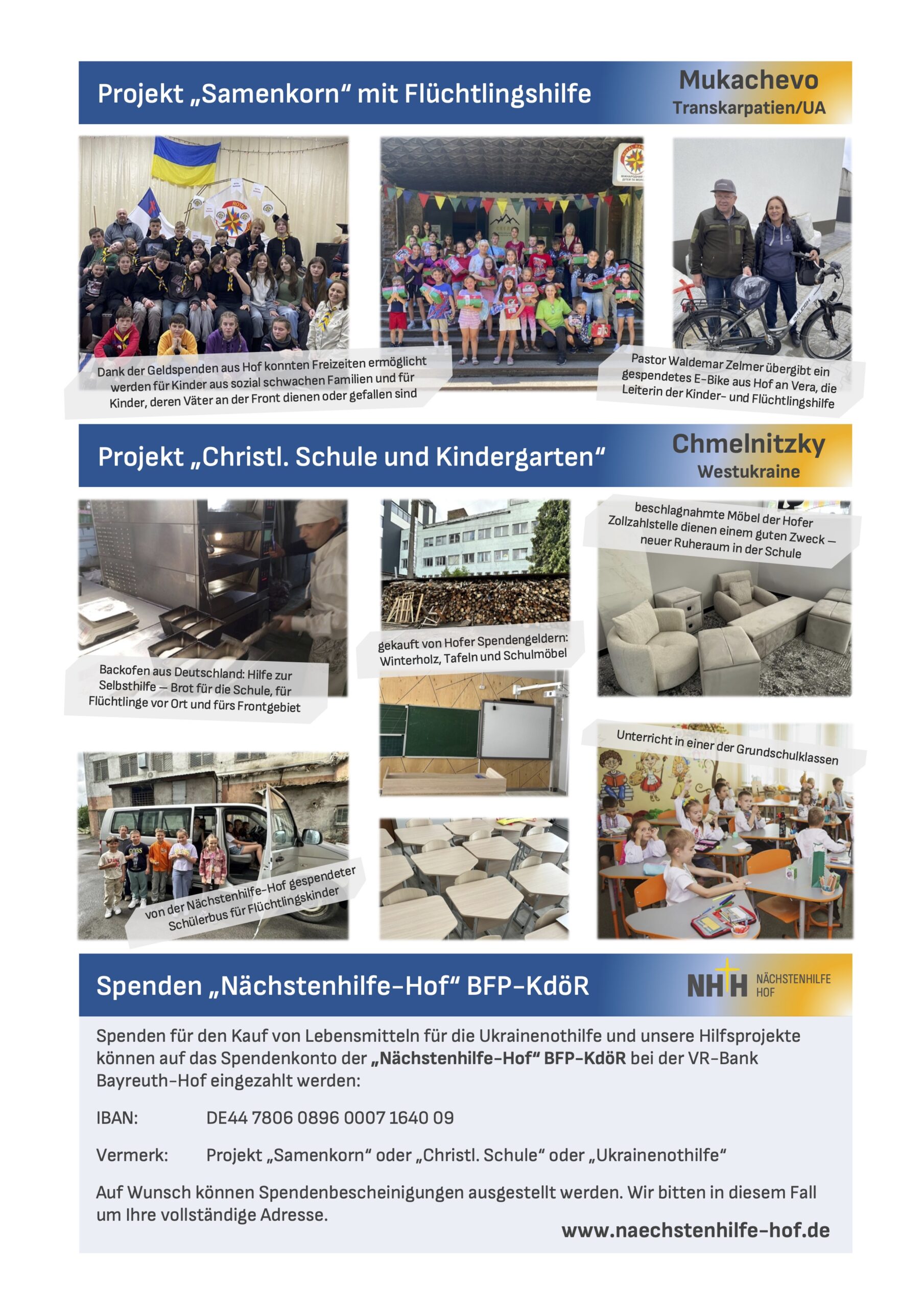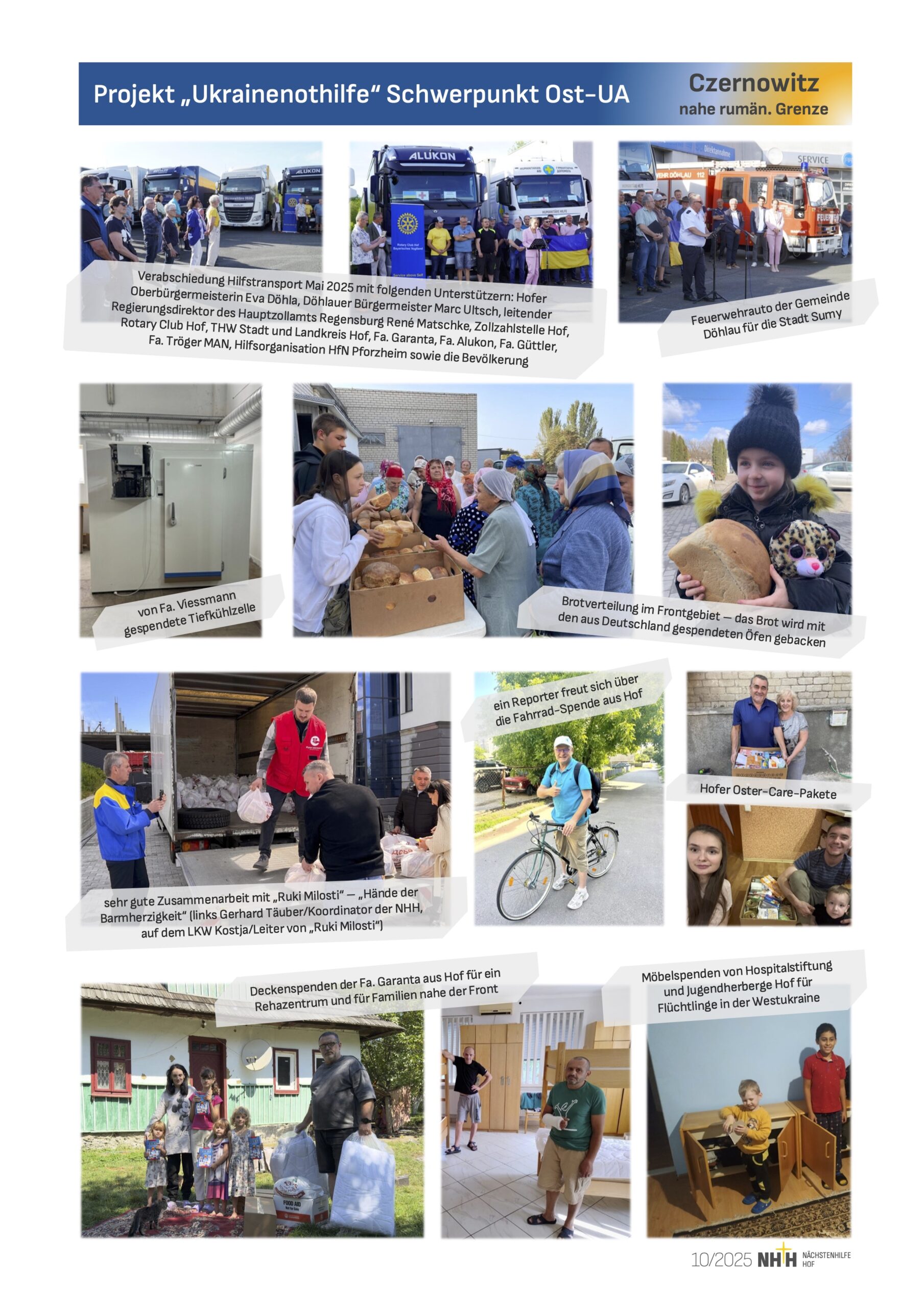 Die Ukrainenothilfe der „Nächstenhilfe-Hof“ unterstützt des Weiteren eine Kirchengemeinde in Czernowitz (Westukraine, nahe der rumänischen Grenze), deren Mitarbeiter und Pastoren wöchentlich in die Kriegsgebiete fahren, um die dort verbliebenen Menschen mit dem Nötigsten zu unterstützen. So werden die Hofer Hilfsgüter von Czernowitz aus an die Notleidenden in der Ostukraine verteilt.
